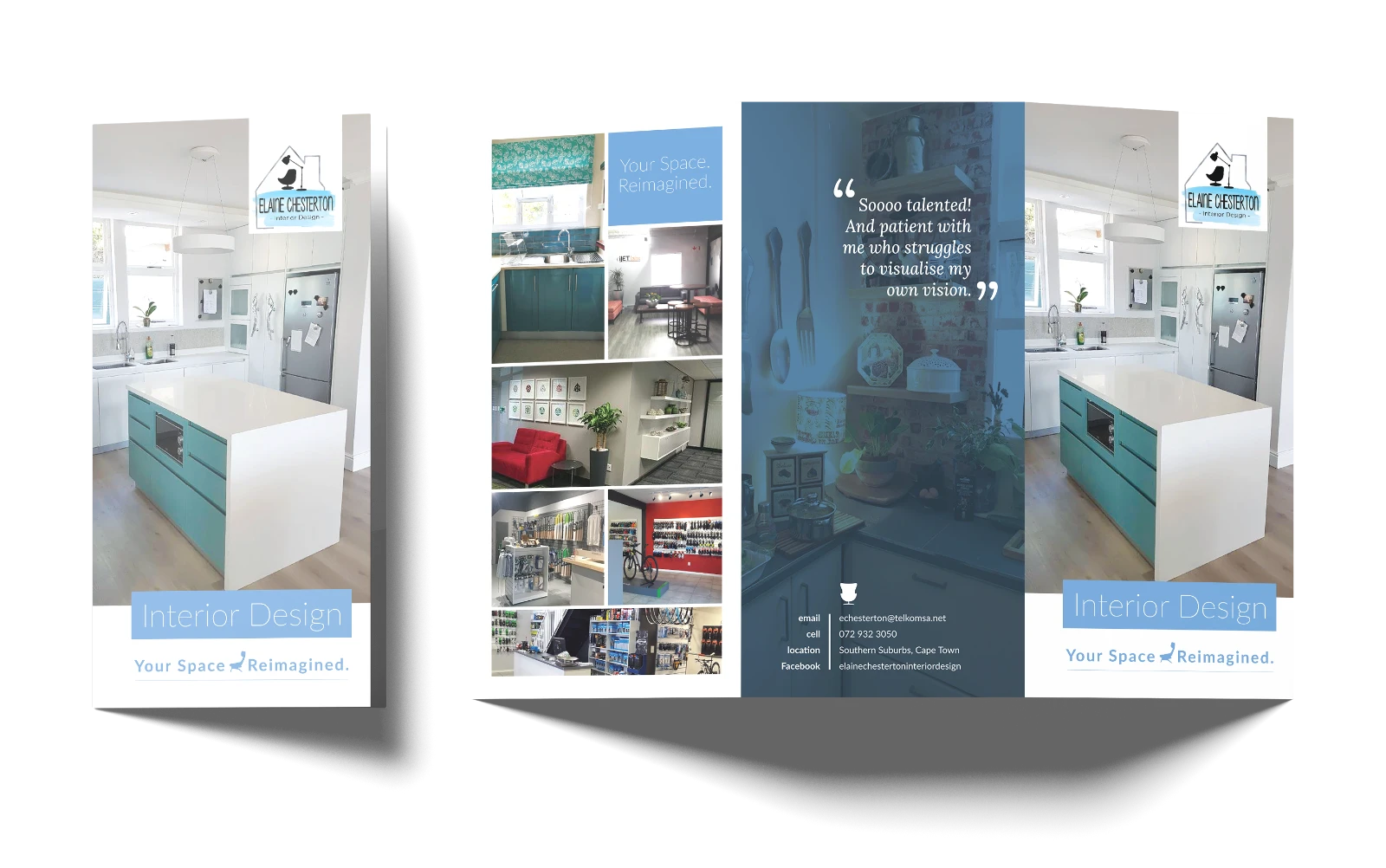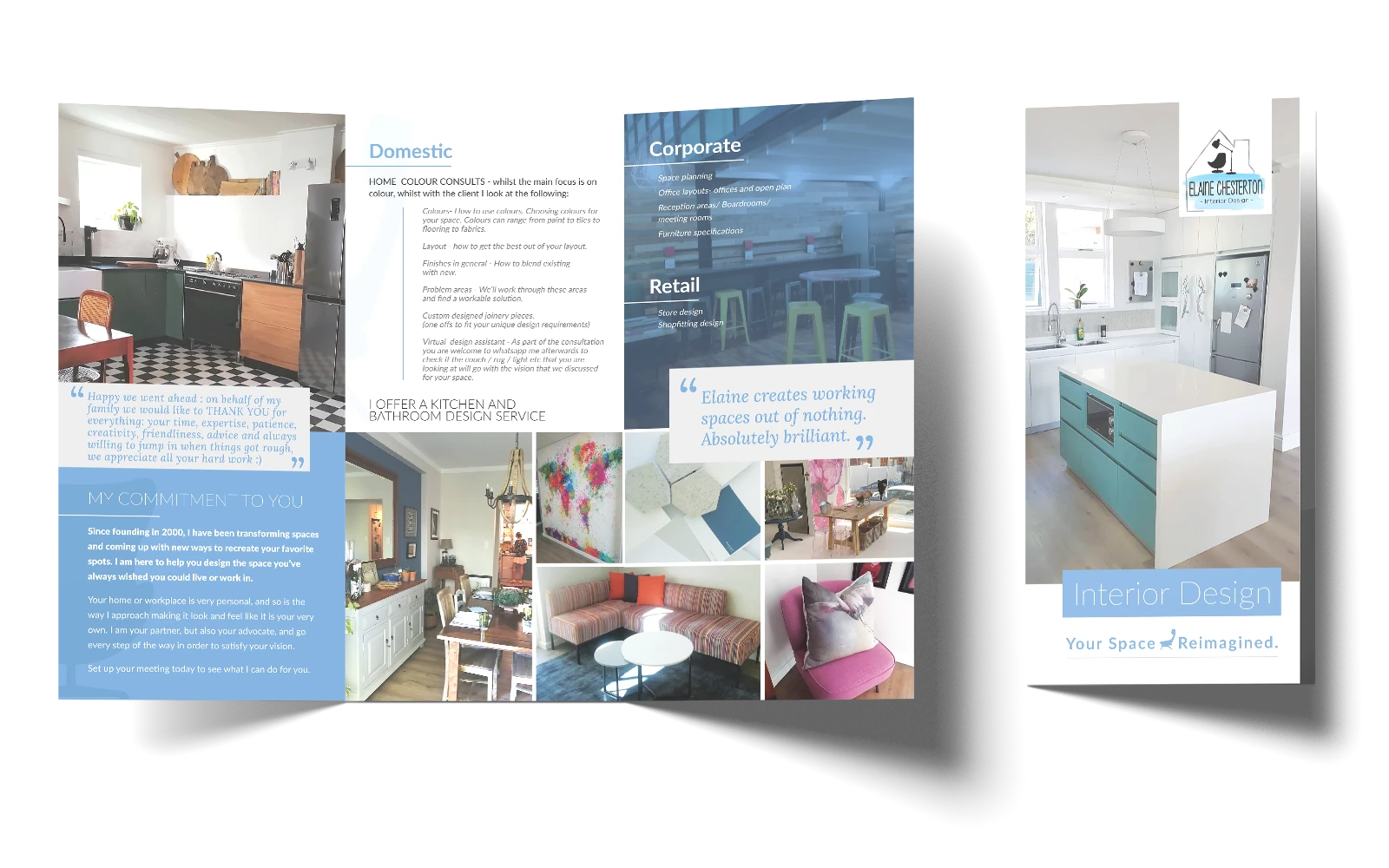 A tri-fold or z-fold brochure design to promote the services of Elaine Chesterton.